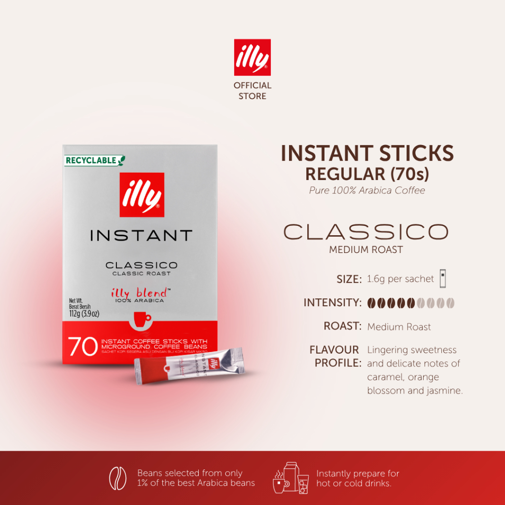 The great taste of illy coffee, in an ultra-convenient instant format. Lingering sweetness and delicate notes of caramel, orange blossom and jasmine or pleasantly robust finish, with warm notes of cocoa and dried fruit.Instant coffee with roasted ground coffee, 100% arabica beans instant coffee with with microground arabica coffee beans roasted in Italy.